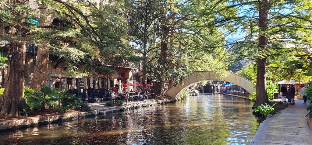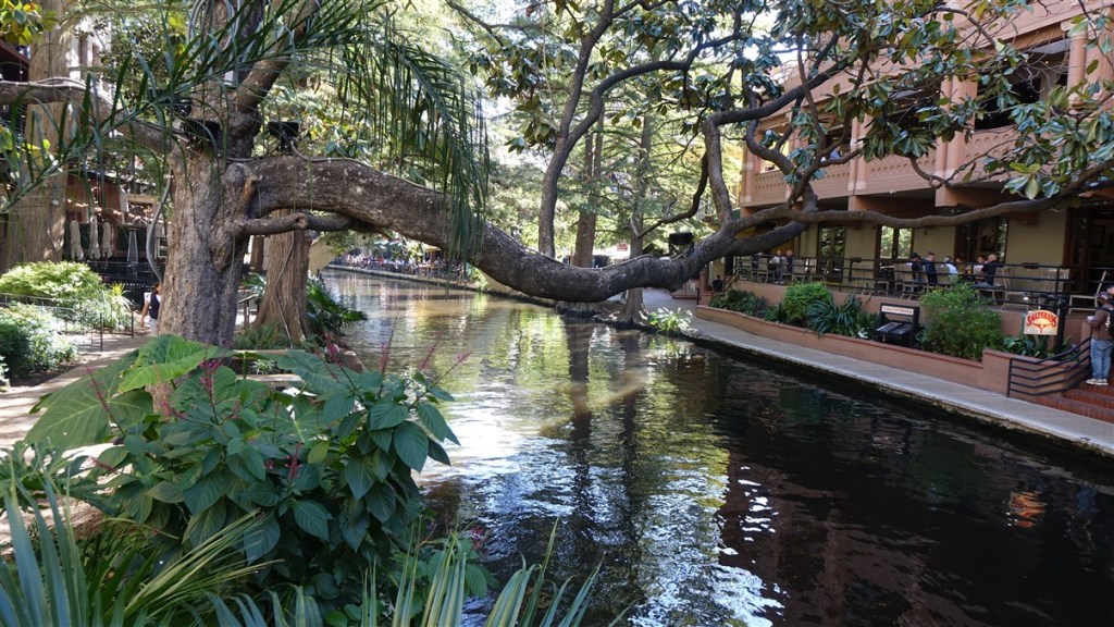 Daarna lopen we naar de Riverwalk. De rivier de San Antonio kronkelt zich door de stad en langs de oevers lopen wandelpaden. In het centrum prachtig begroeid met planten en grote bomen. Heel veel terrasjes, met erachter restaurantjes en hotels. Leuk om rond te wandelen, maar wel heel toeristisch. Kijken en bekeken worden vanaf de terrasjes. Ook wij doen lekker mee met een pilsje. Dat is het voordeel dat je met de bus weer teruggaat….