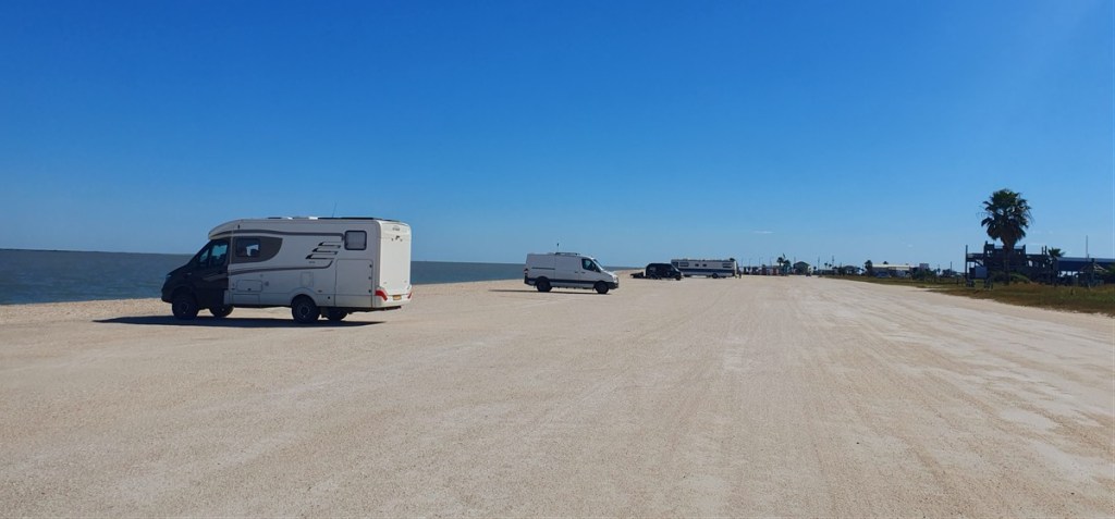 We nemen het risico niet en overnachten op Jamaica Beach, Galveston Island State Park. Ook hier mag Hannes lekker op het strand.