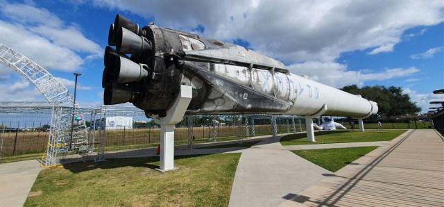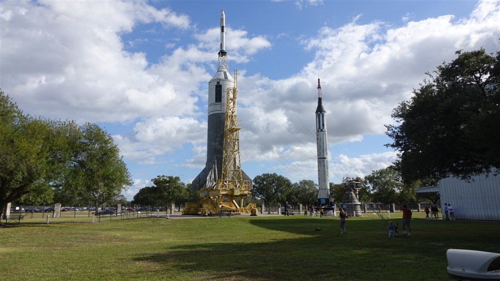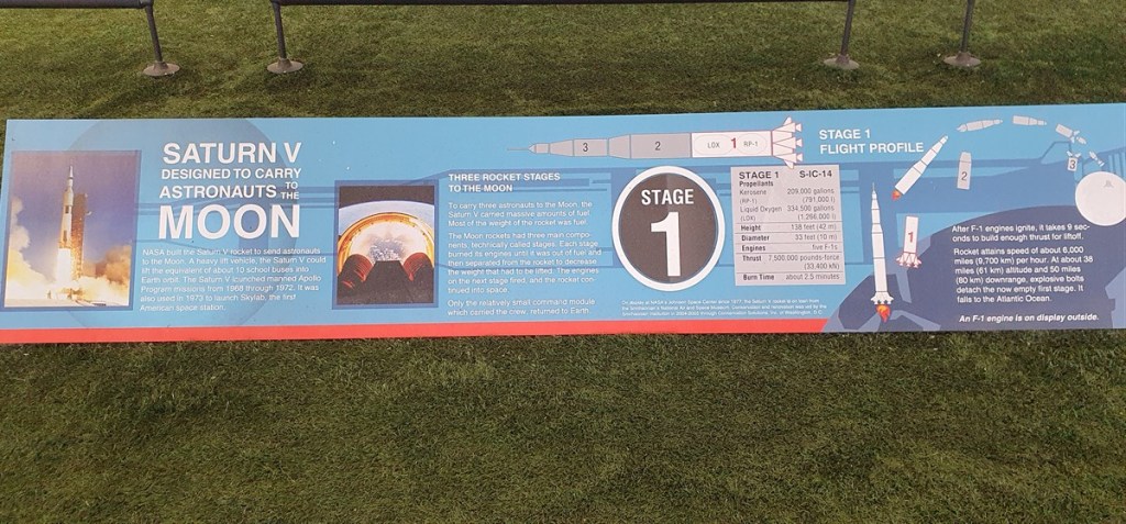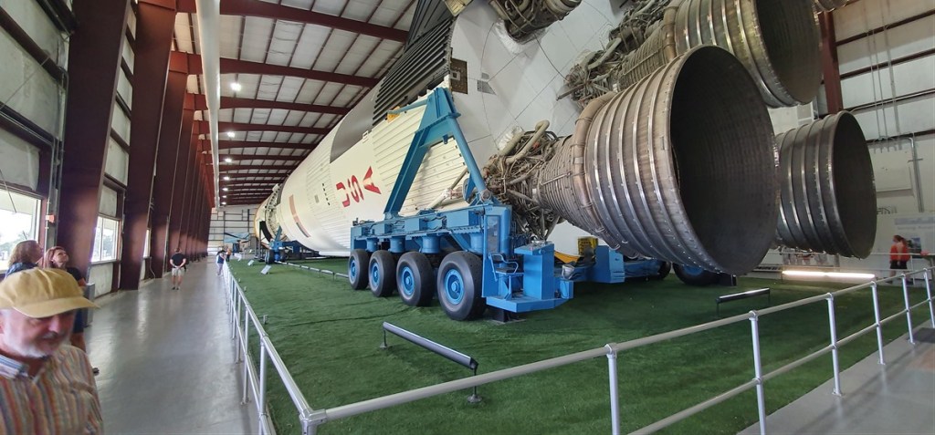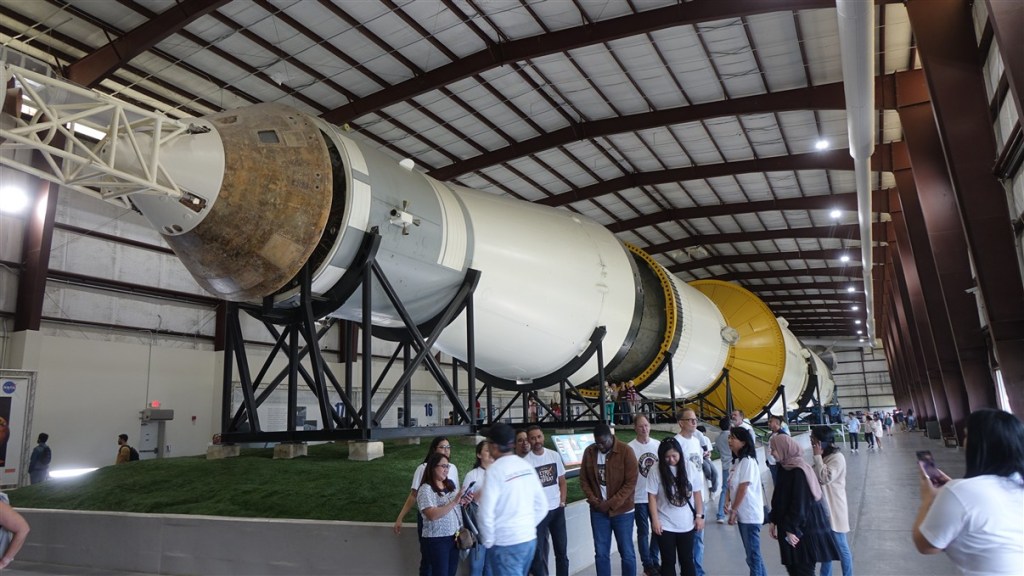 Een treintje brengt ons naar het Rocket Park. Daar ligt een Saturn V raket. 111 meter lang opgedeeld in 3 delen. Ieder deel heeft zijn eigen motoren voor de specifieke verbrandingsfases. Wat een enorme bak brandstof gaat hier de lucht in en verdampt in luttele minuten…. We krijgen een uitgebreide uitleg van iemand van NASA. Heel erg interessant!
