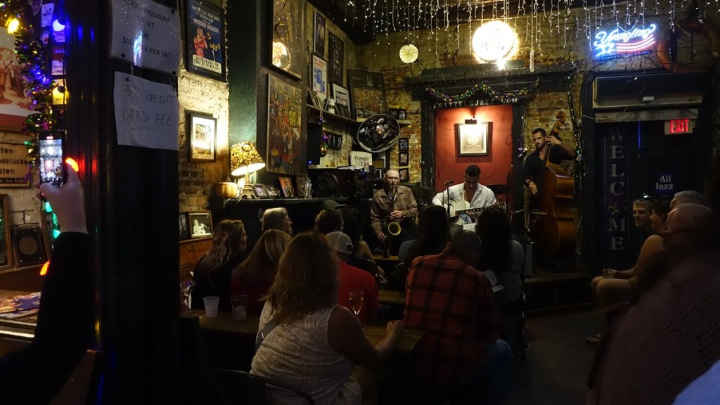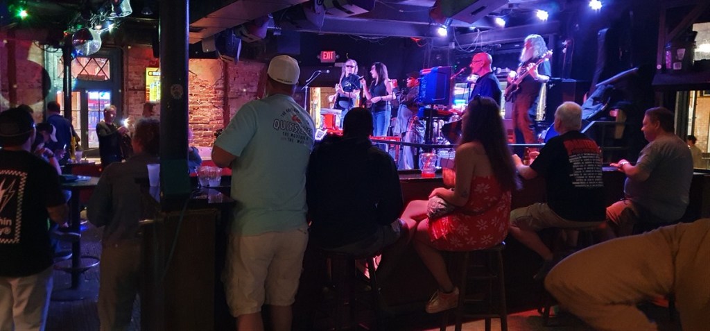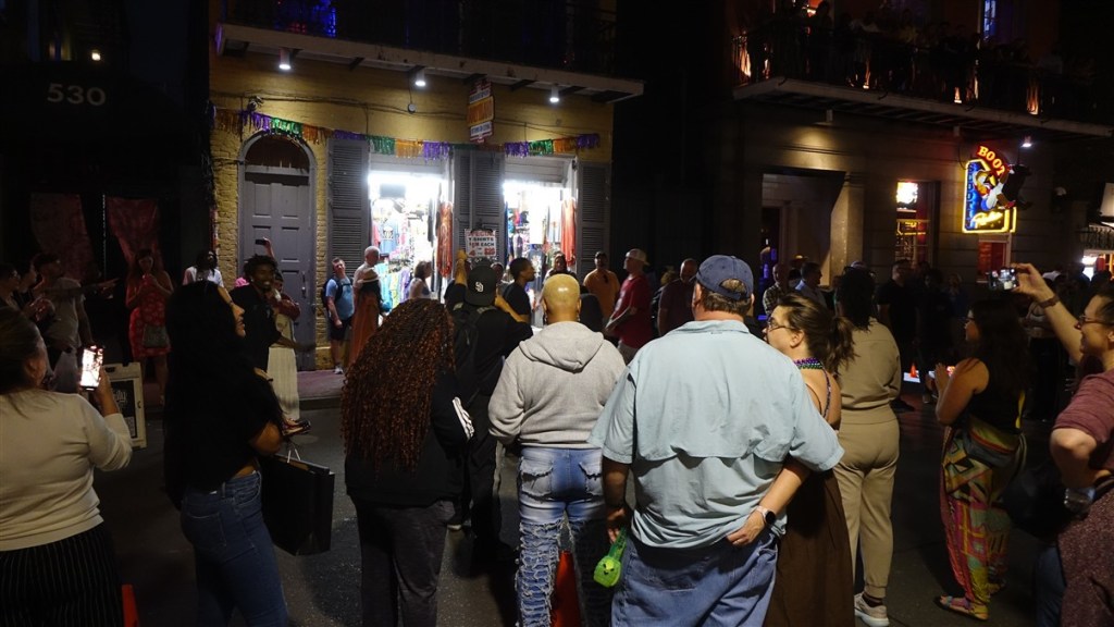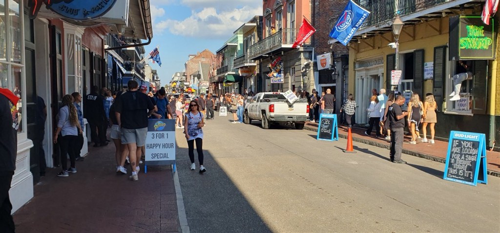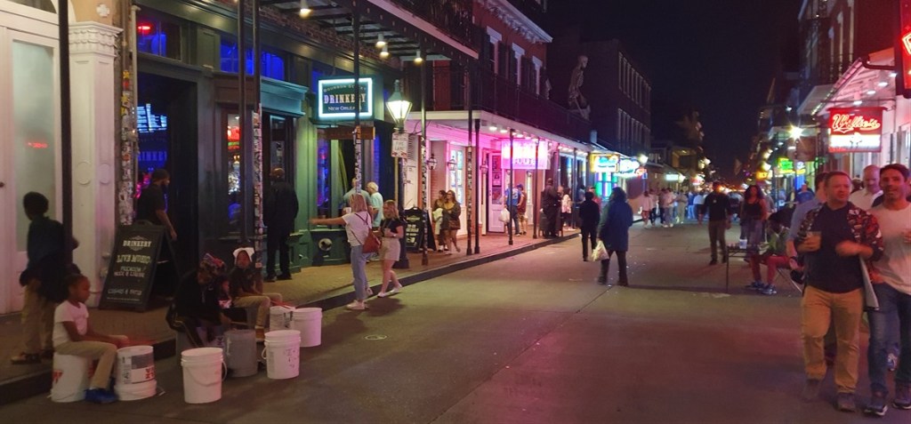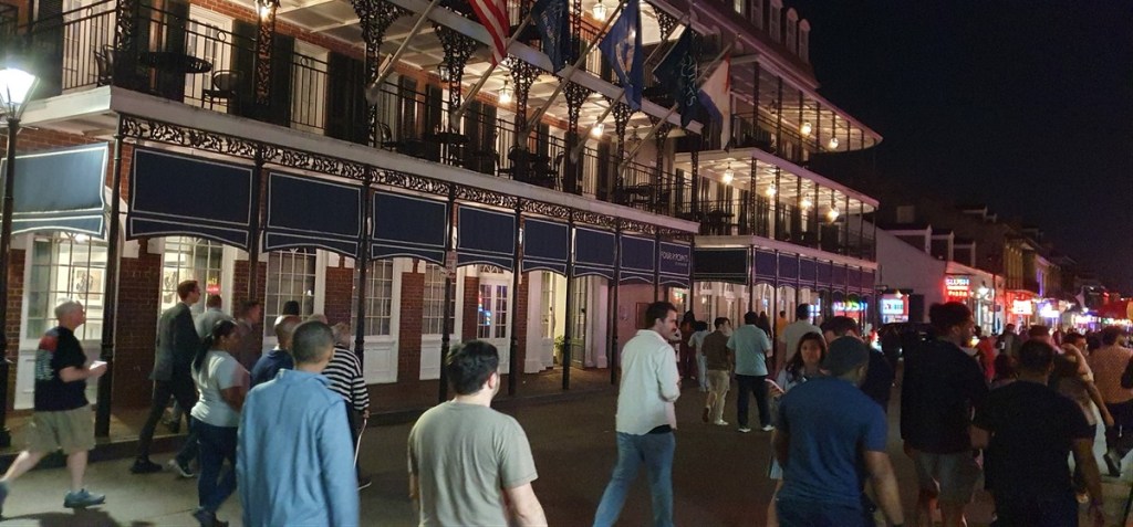 Bourbon Street is DE feeststraat met de ene na de andere kroeg en restaurant met live muziek. Het is gezellig! De sfeer is gemoedelijk en feestelijk. We wandelen wat rond, drinken wat, eten wat en genieten van de live muziek, van jazz tot blues tot rock & roll.