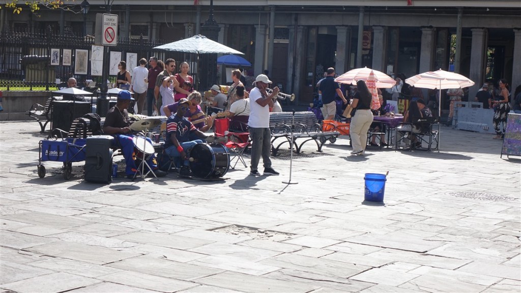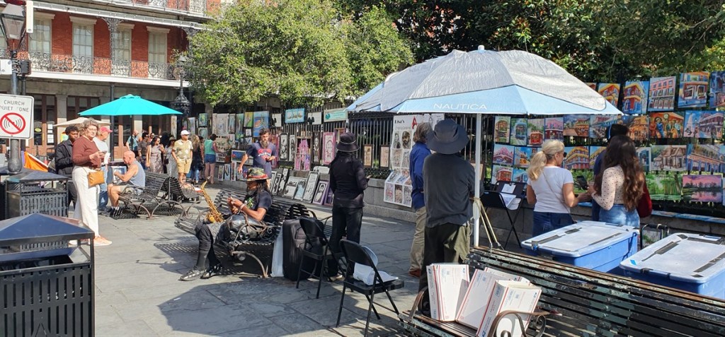 Lopen verder langs het water naar Jackson Square. Hier veel kunstenaars en opnieuw live muziek. Krijg het aan de stok met een muzikant die geld wil voor een foto…. Ondertussen maakt Frans een prachtig foto van de man…..