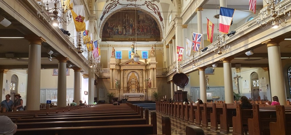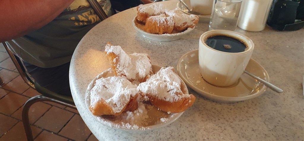 Kijken even binnen in de St. Louis Cathedral (18e eeuw met mooi glas in lood). Lunchen bij het beroemde Café du Monde. Beignets met koffie van koffie en cichorei (enige wat je daar kunt krijgen).