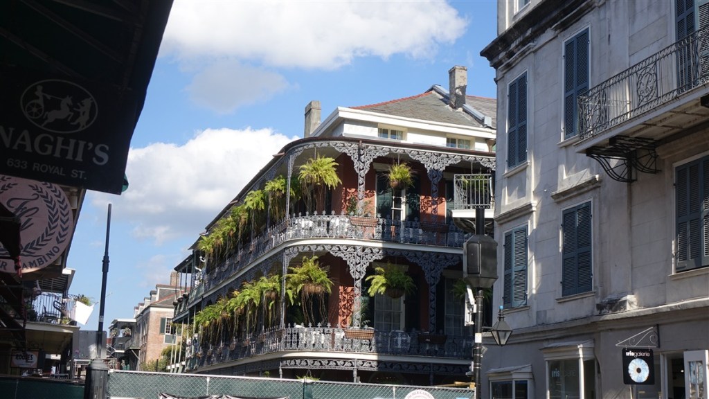 We hebben een camping uitgezocht aan een jachthaven met shuttle service naar het centrum. Om 5 uur gaan we met de shuttle de stad in naar de French Market. We lopen naar Bourbon Street langs prachtige oude huizen met gietijzeren balkonnetjes en veranda’s, vaak mooi beplant.