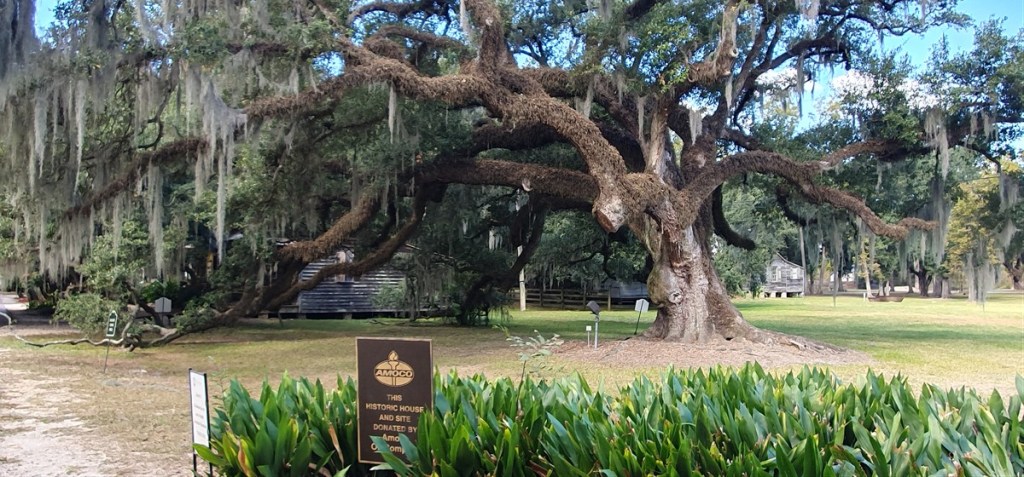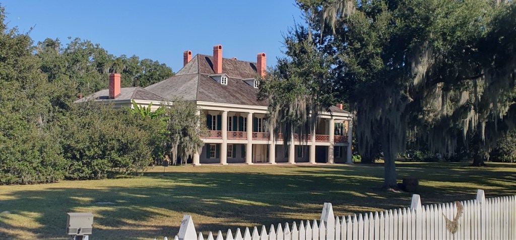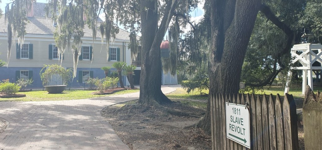 We krijgen een rondleiding en horen dat de Destrehan Plantage oorspronkelijk een indigo plantage was (blauwe verfstof gewonnen uit de indigo plant) met ca. 15 slaven. Later werd het een suikerrietplantage met ca. 200 slaven. Opvallend is de inventaris lijst waarop slaven met naam, herkomst, leeftijd, kenmerken/beroep en waarde vermeld staan. Rondom de plantage enorme eiken met Spaans Mos.