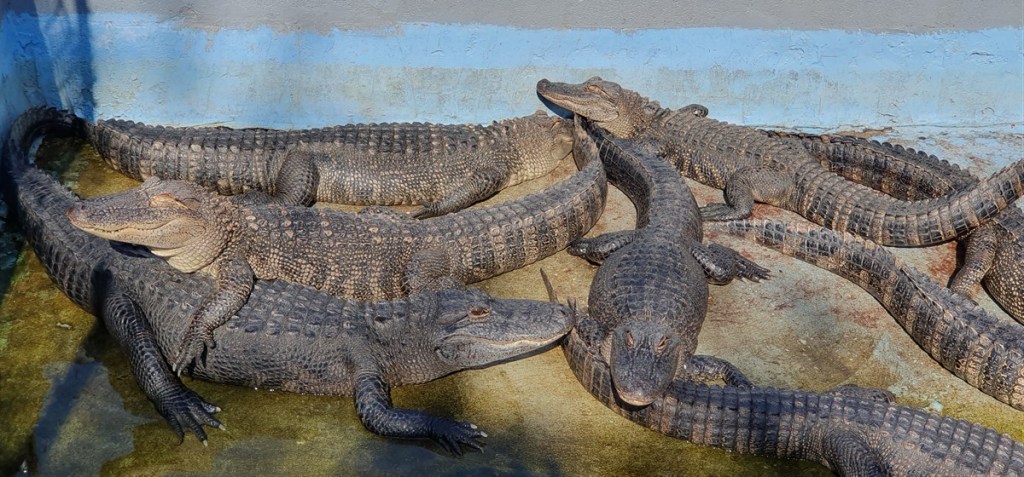 Kijken nog even rond op de opvang zelf. Hier liggen gigantische alligators van wel 5 meter lang die ongeveer 60 jaar oud zijn. Het is nu winterperiode dus de alligators zijn heel rustig (water is voor hen te koud, dat betekent dat ze niet eten omdat ze dat dan niet kunnen verteren). Wat een enorme beesten!