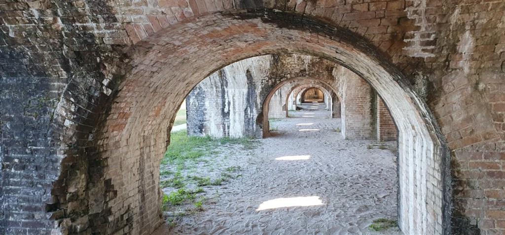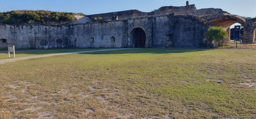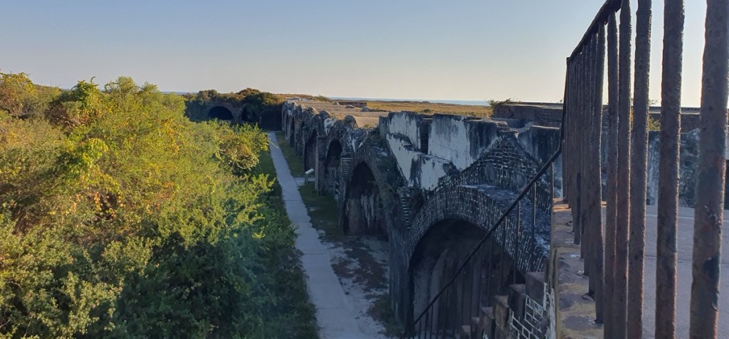 Ondanks de prikkers maken we een mooie wandeling naar het Fort. Het is rond 1800 gebouwd door slaven ter verdediging tijdens de burgeroorlog. In 1861 was het een enclave van de Noordelijke Union troepen. Veel slaven uit het Zuiden vluchten hierheen en vandaaruit over zee naar de vrijheid in de Noordelijke Staten. In de 2e WO is het fort gemoderniseerd met enorme (draaiende) kanonnen met het oog op Duitse onderzeeboten…..