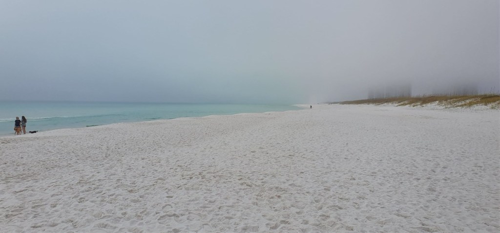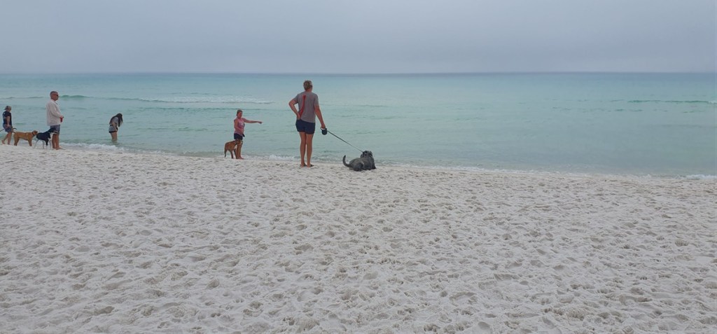 Donderdag 20 november vertrekken we en rijden over het schiereiland naar Navarre Beach. Het is mistig en onderweg mag Hannes even rennen op het hondenstrand. Denken we….. Het hondenstrand blijkt ongeveer 100 meter breed, honden mogen niet los en het is het drukst bevolkte stukje strand in de verre omtrek….