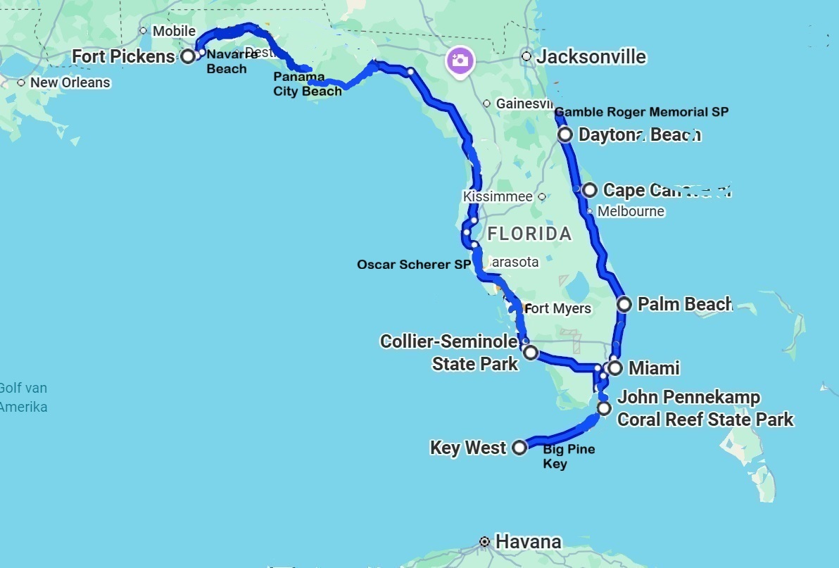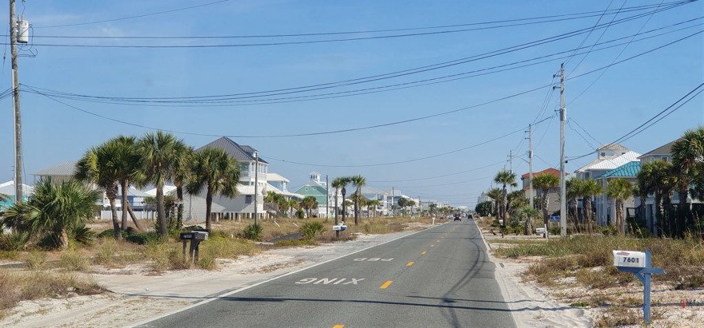 Onderweg kopen we een transponder voor de tolwegen in Florida. Blijkt nog een hele klus om die met een buitenlands kenteken aan de praat te krijgen. Je moet een adres in Amerika, Canada of Mexico hebben. Uiteindelijk krijgen we de transponder aan de praat met een adres van familie in Canada! We overnachten op een picknick plaats bij Panama City. De volgende ochtend verder langs de kust. Veel mooie huizen aan het strand en soms loopt de weg gewoon dwars door het water.