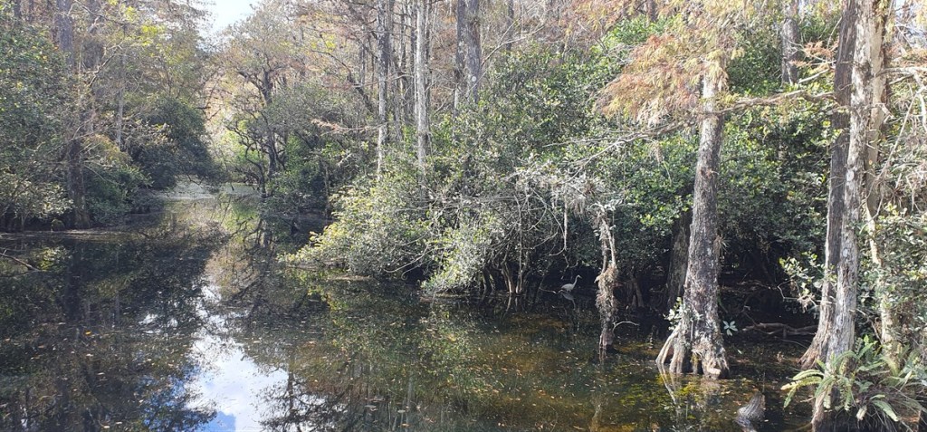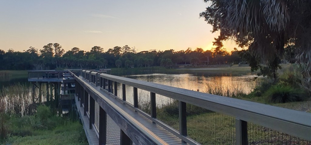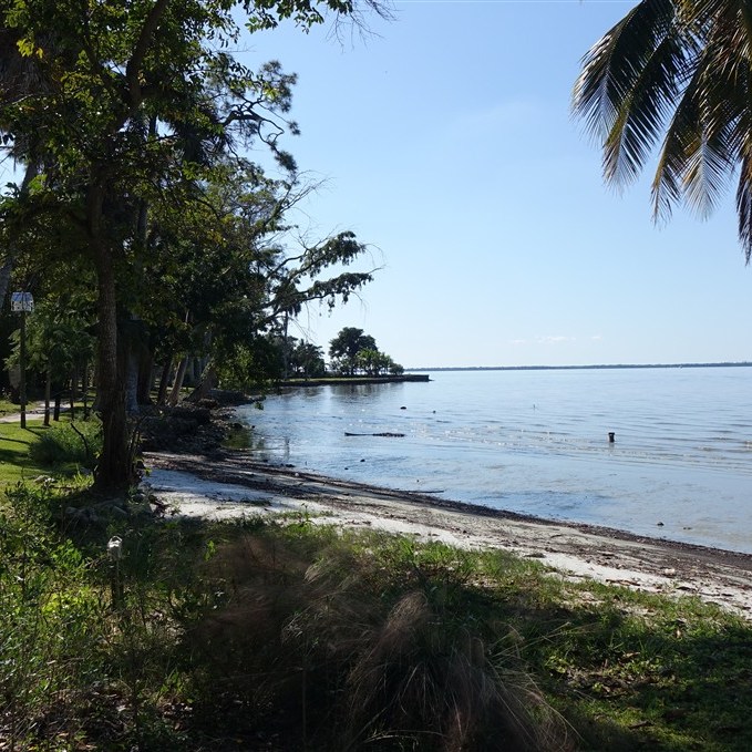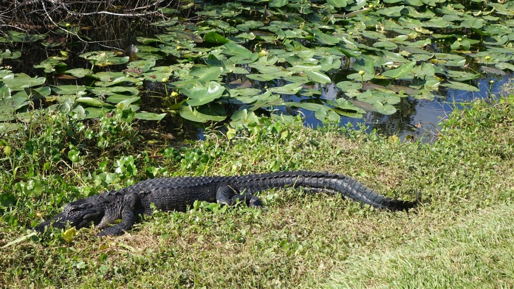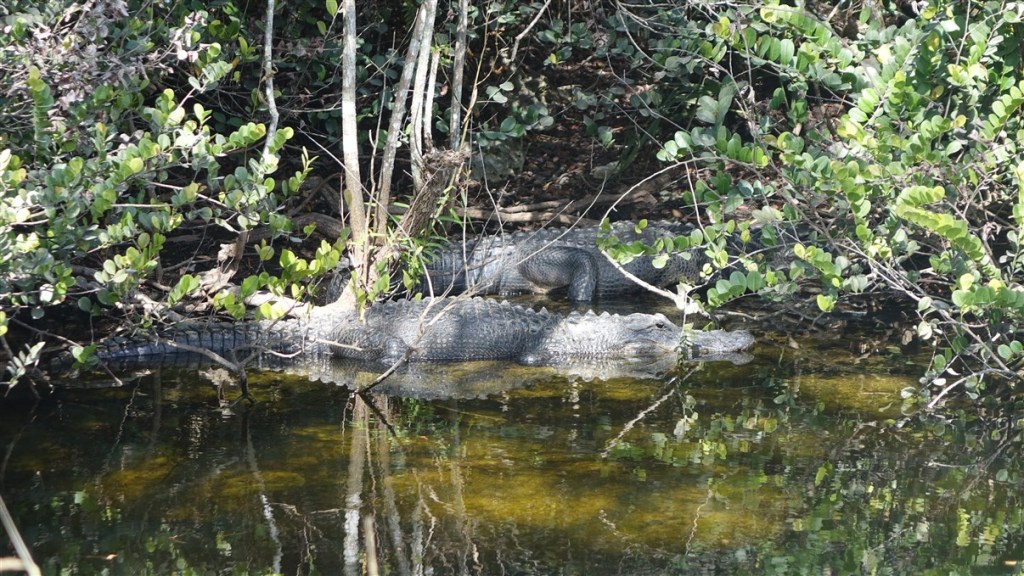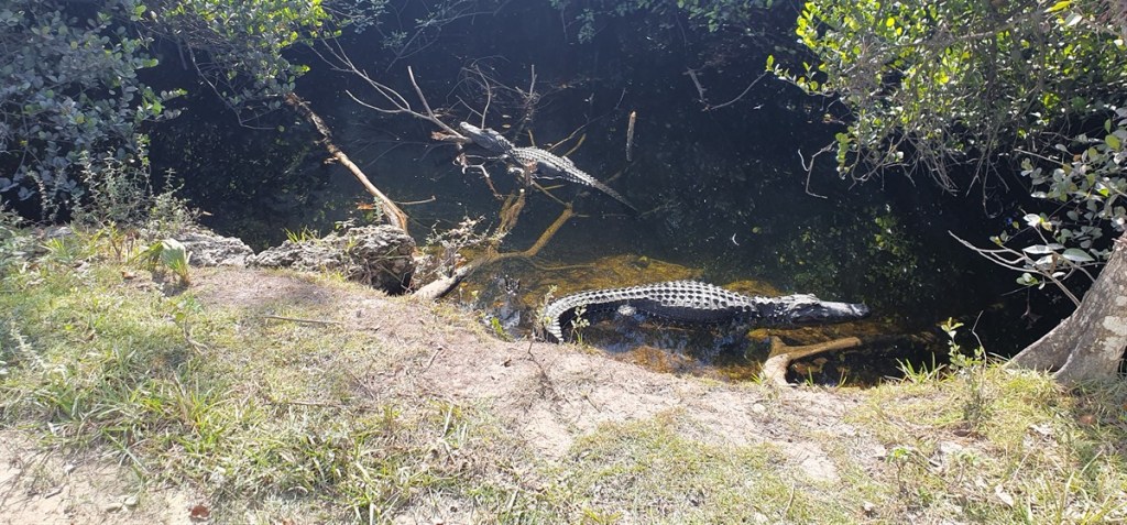 Dan een heel stuk door het binnenland. Het lukt niet om een goede overnachtingsplek te vinden dus voor het eerst tijdens onze reis overnachten we op de parkeerplaats van de Walmart. Prima plekje aan de zijkant onder de bomen. Het is vrijdagavond, dus wel wat onrustig met jongeren die in grote pickup trucs met harde muziek rondrijden. Gelukkig is het (heel braaf) om 11 uur afgelopen. We vervolgen onze route met een lange rit door de binnenlanden van Florida om de grote steden Tampa en St. Petersburg heen naar het Oscar Scherer State Park. Prachtig gelegen in het ‘oerwoud’. We staan midden tussen de palmen aan een riviertje met overal de waarschuwing Aligiators! We zijn er al rond half vier…. Lekker vroeg!