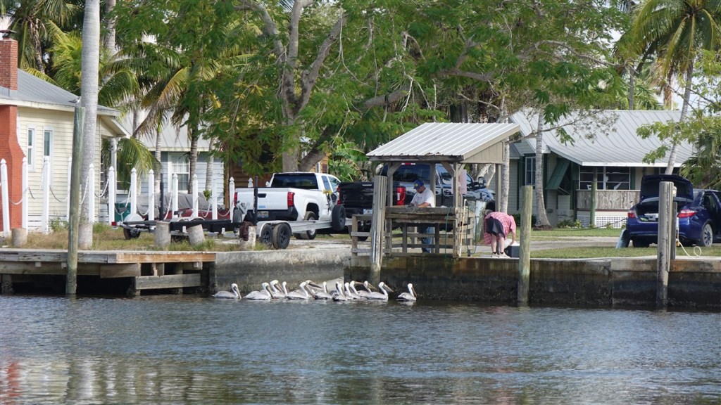 Terug hebben we wat meer aandacht voor de huizen en werkzaamheden langs de oever. De pelikanen wachten keurig bij het schoonmaken van de vis op hun deel.
