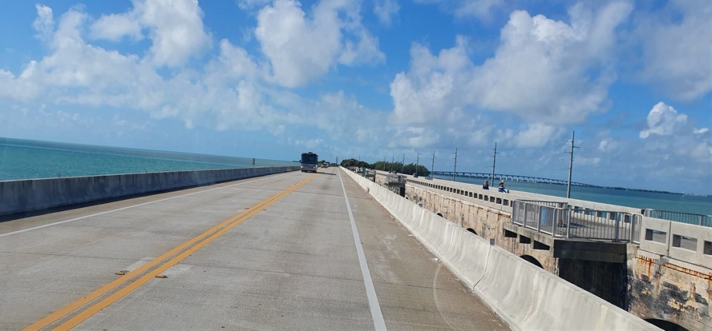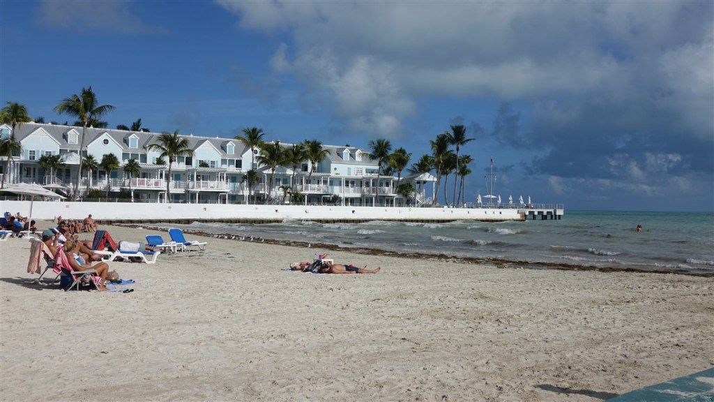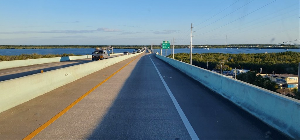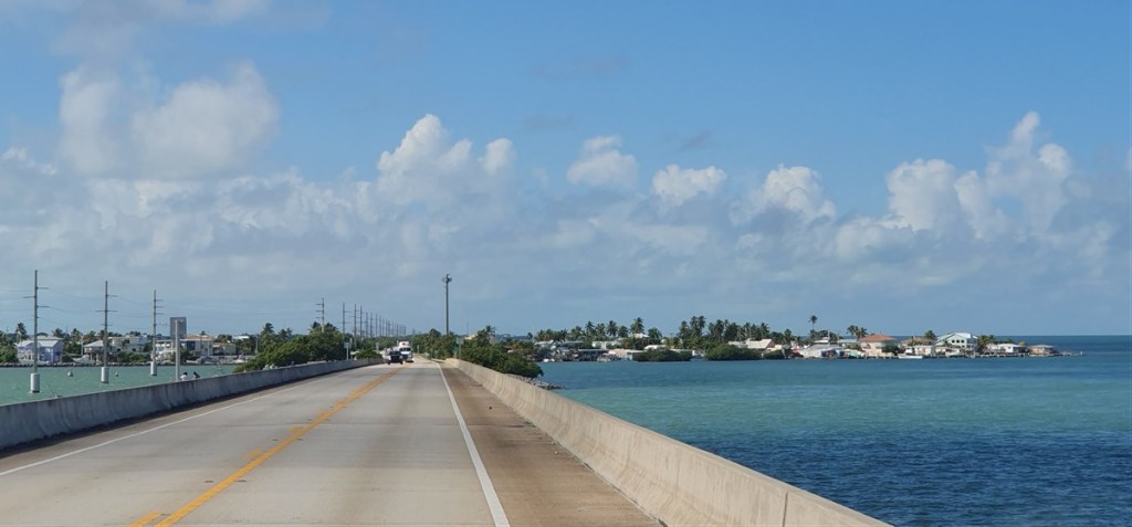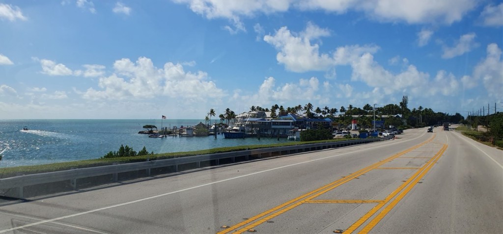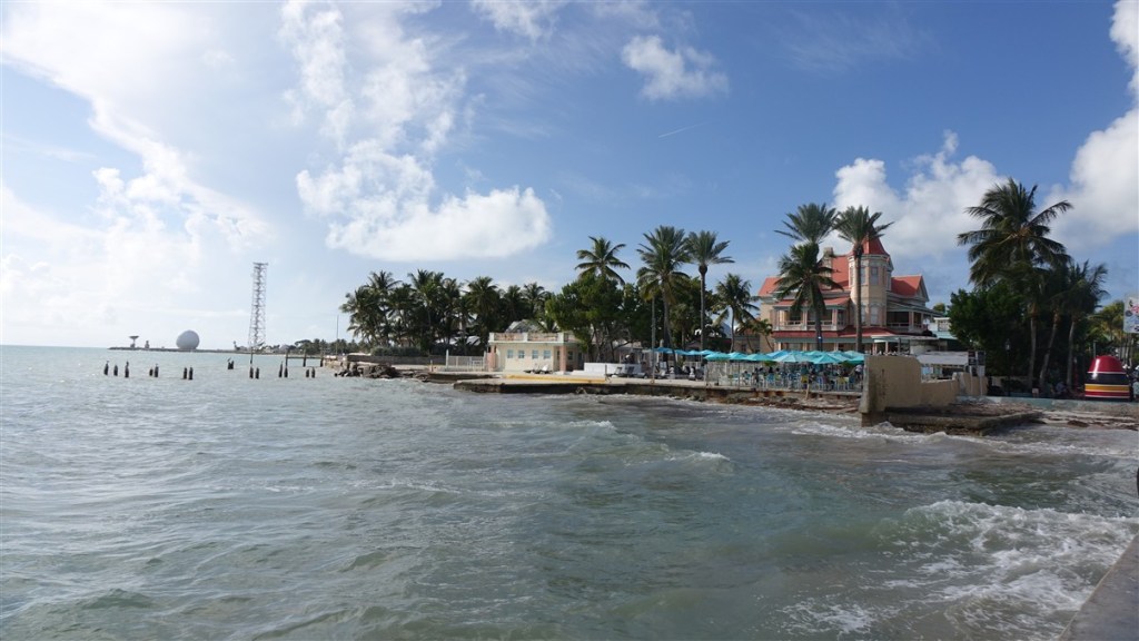 ’s Ochtends komen we de dame die ons gisteren aan een plekje geholpen heeft weer tegen. Ze biedt ons voor vanavond weer plek aan! Toch heel bijzonder als je weet dat op internet alle State Parks al weken volgeboekt zijn! Je moet echt mazzel hebben om ergens een plekje te kunnen reserveren. Toch zien we overal lege plekken. Je moet van te voren betalen en als je niet op komt dagen worden deze ‘lege’ plekken niet vrijgegeven. Je zou immers nog kunnen komen…. Wij maken geen gebruik van haar aanbod want we hebben voor vanavond een plek geboekt op een reguliere (dure) camping op Big Pine. We rijden naar Key West over het ‘parelsnoer’ van eilanden die de Key’s vormen. Onderweg veel bruggen, gras en moeraslandschappen en zee. Maar vooral veel saaie lintbebouwing.