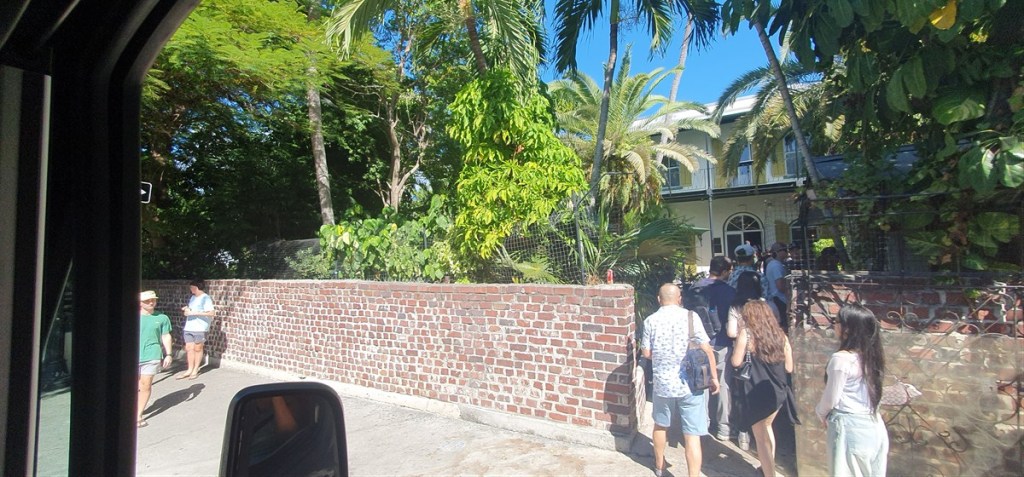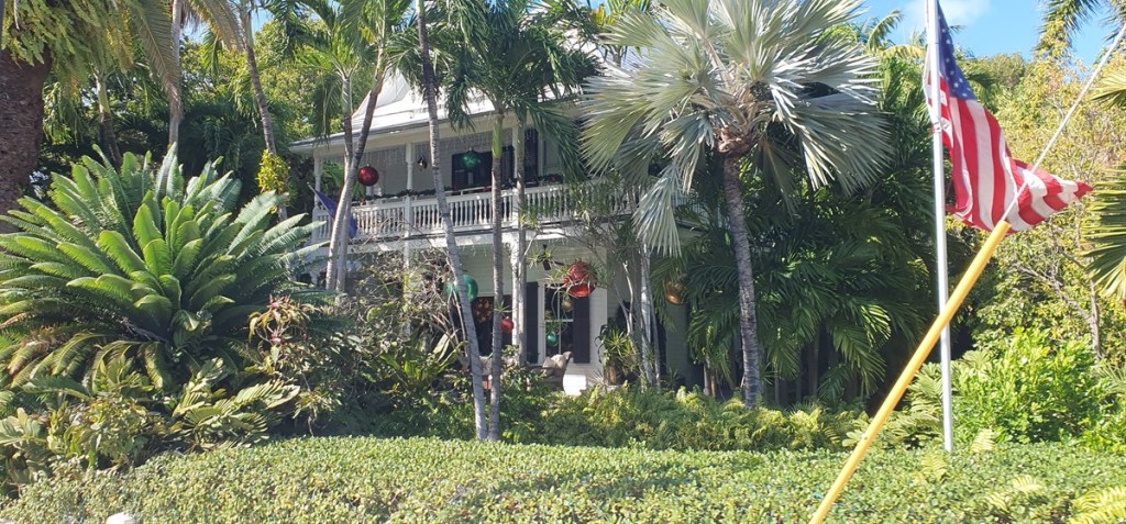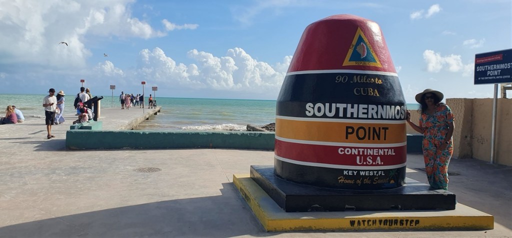Vlak voor Key West parkeren we de auto (rv parking verboden in het centrum) en gaan met de bus de stad in. Leuk oud centrum met mooie houten huizen. We lopen langs het Hemmingway Huis (hier heeft hij van 1931 tot 1940 gewoond) naar het meest Zuidelijke puntje van Amerika, 90 mijl van Cuba.