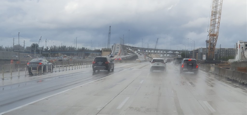 We zijn de stad nog niet uit of een paar enorme onweersbuien barsten los en is het toch weer druk op de weg. Zo is het niet leuk om bij pad te zijn.