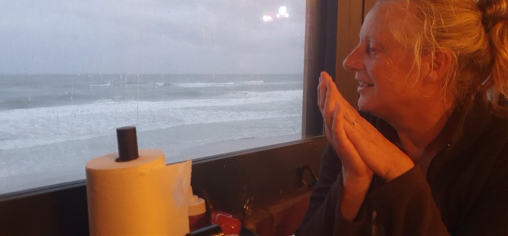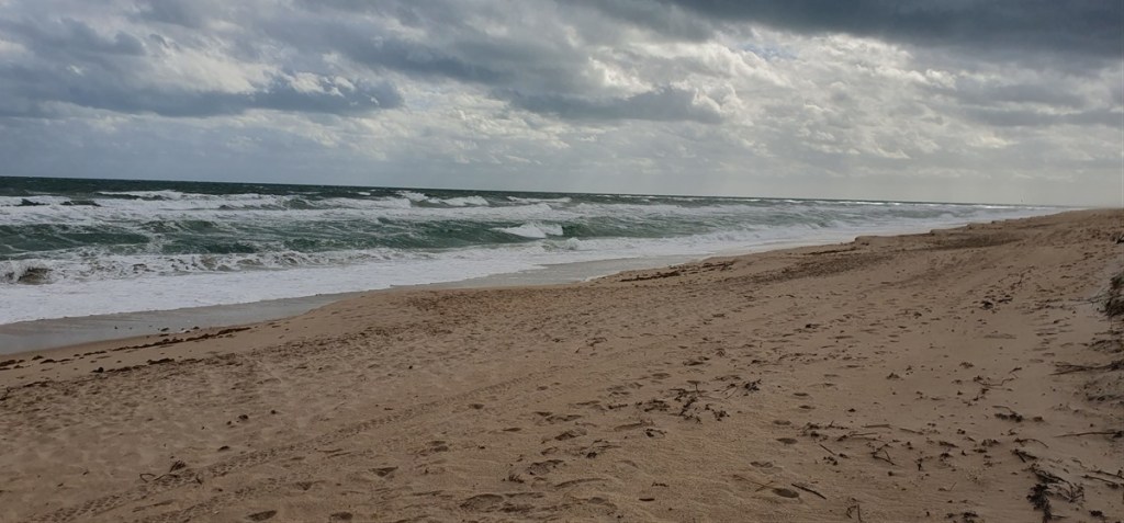 We stoppen op één van de weinig vrije plekken op een parkeerplaats langs de weg. Prima. Het waait hard maar we staan redelijk beschut. We worden door de wind in slaap geschud. Het gaat gelukkig wat beter met de uitslag en de jeuk van Frans. De medicatie helpt. We lopen nog even langs het strand (Hannes mag er helaas niet op) en rijden dan verder.
