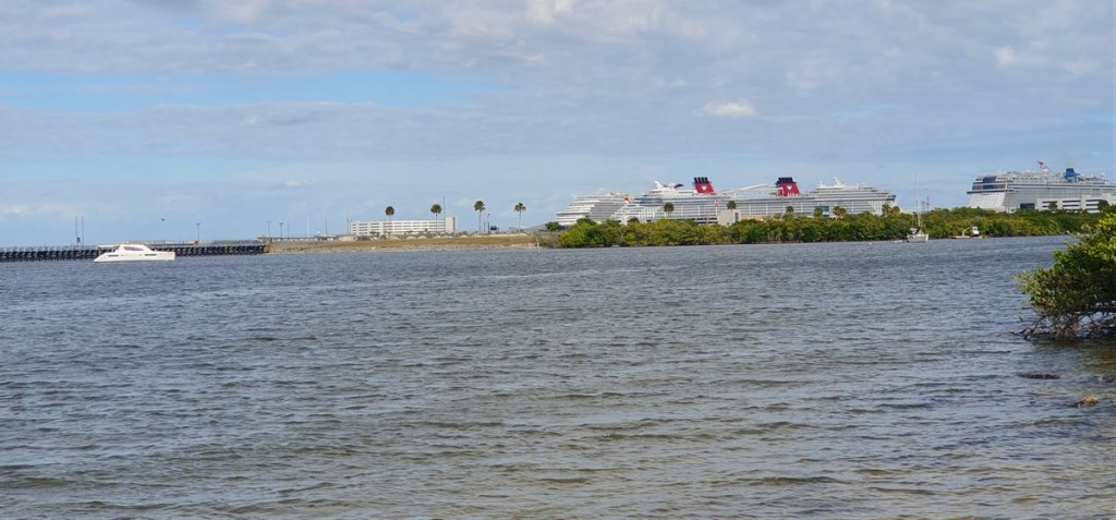 We lunchen met uitzicht op Cape Canaveral (lanceer complex) en idioot veel cruiseschepen!