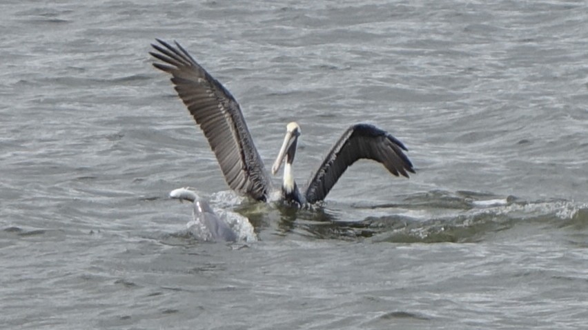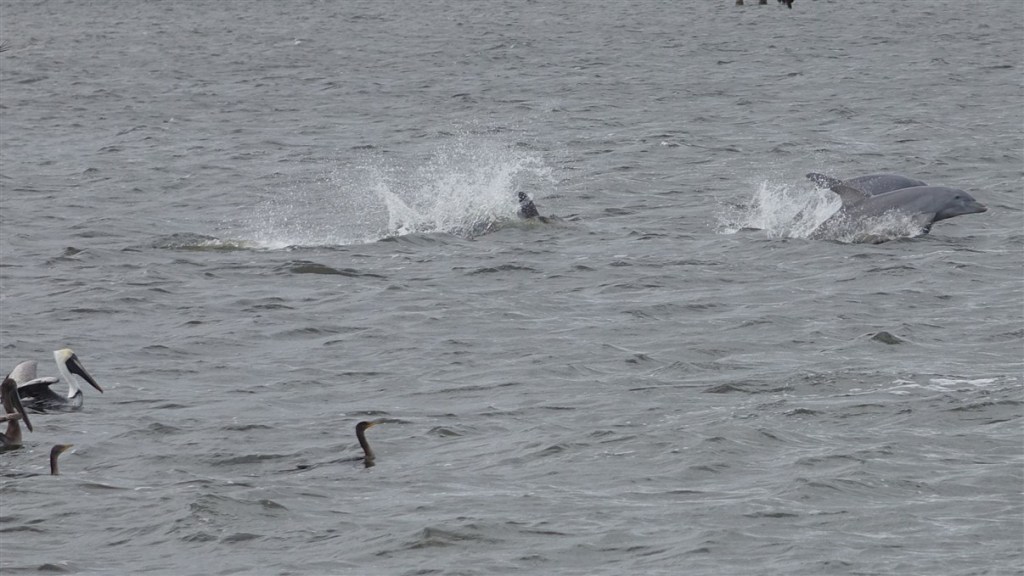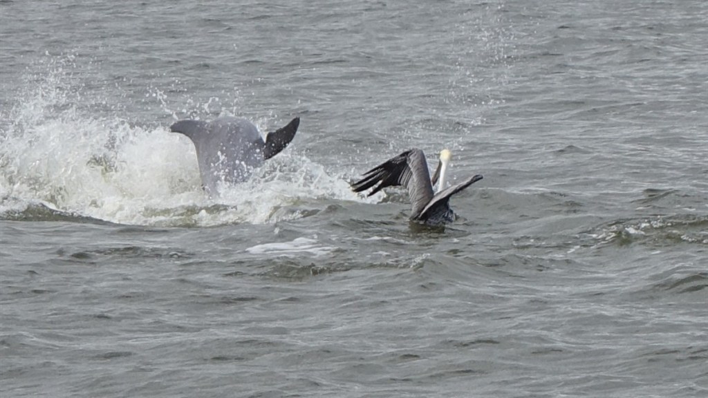Op zee is het net of dolfijnen en pelikanen met elkaar spelen. Later zien we op de foto wat er echt aan de hand is. Beiden zijn op jacht naar dezelfde vis!