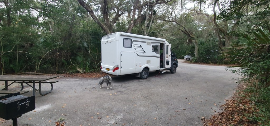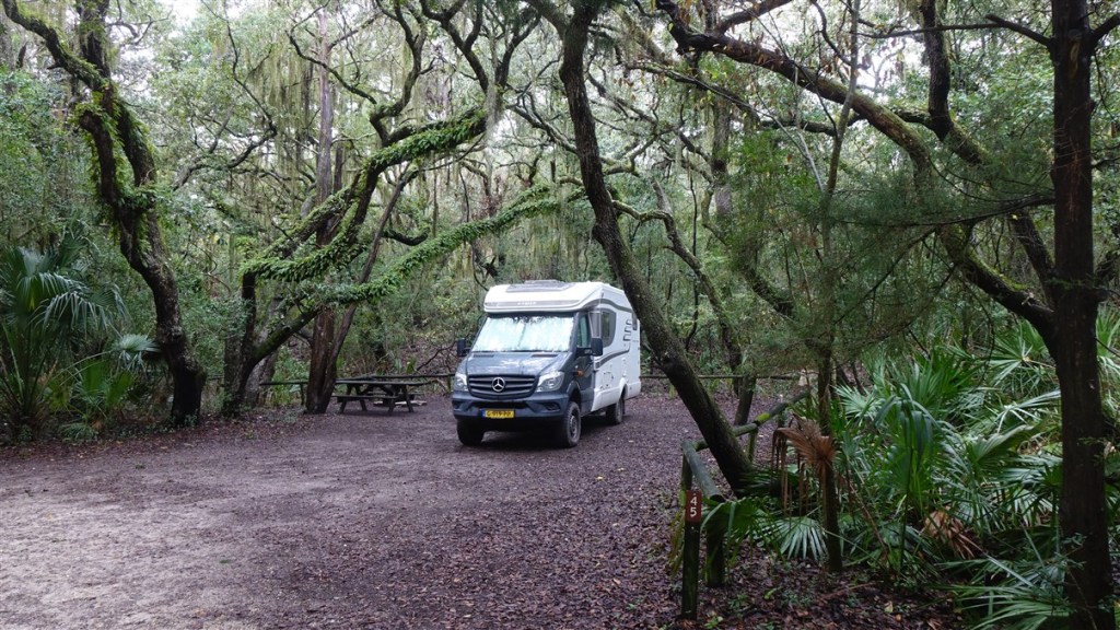 Terug naar waar we gebleven waren. Donderdag 4 december. We moeten weg van onze mooie plekje aan het strand van het Gamble Rogers Memorial State Park, er is de komende weken geen plekje meer vrij. Klusje dag vandaag. Gasfles en koelkast moeten gevuld worden. Daarna rijden we naar Anastasia State Park. Opnieuw een plekje bij het strand, maar ditmaal staan we tussen de palmbomen. We missen het geluid van de zee….