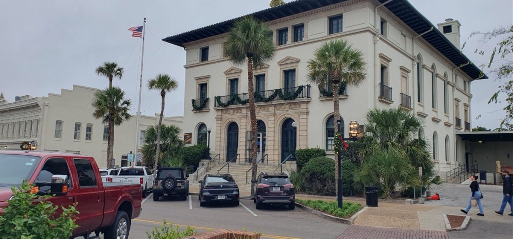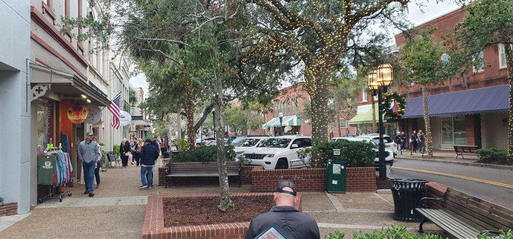 ’s Ochtends is het nog steeds grijs en koud en in de loop van de middag begint het te regenen. Frans heeft nog steeds heel veel last van zijn rug en we doen dus rustig aan. ’s Middags rijden we het stadje Fernandina Beach in, tot 1800 een piratennest. Nu is het een knusse Victoriaanse badplaats. Het Historische District heet Silk Stocking District naar de rijkdom van de bewoners. Prachtige huizen in diverse stijlen (Queen Ann, Italiaans, Chippendale) wisselen elkaar af.