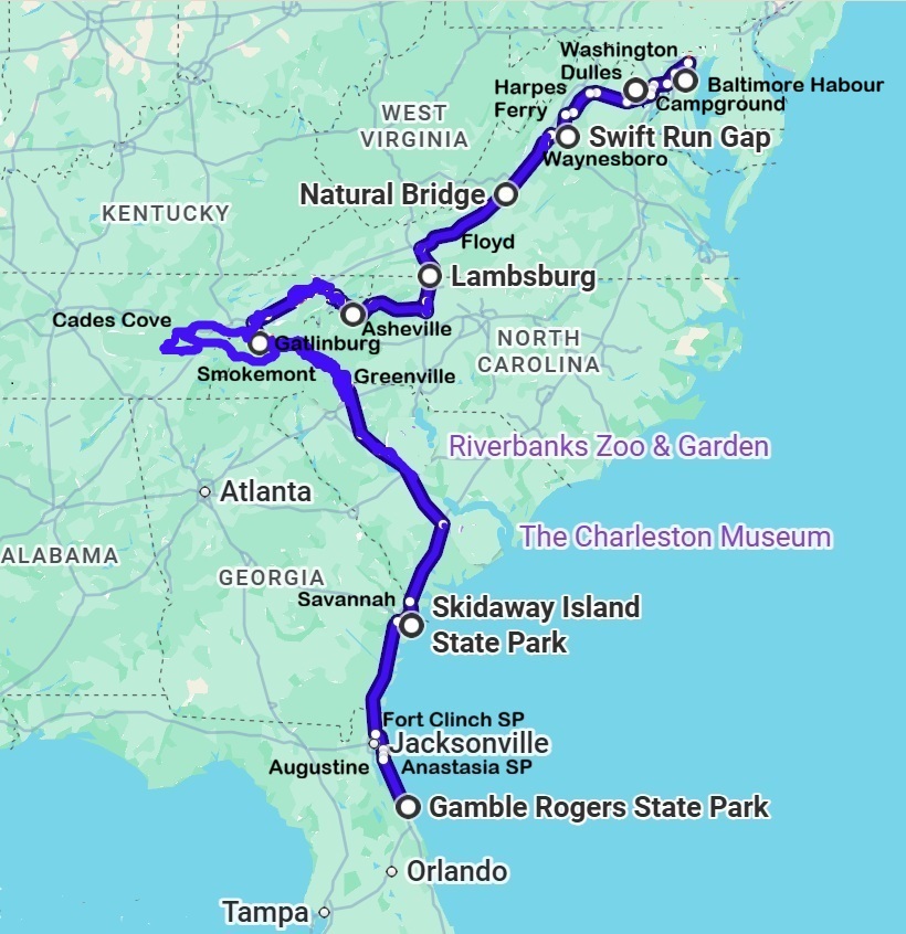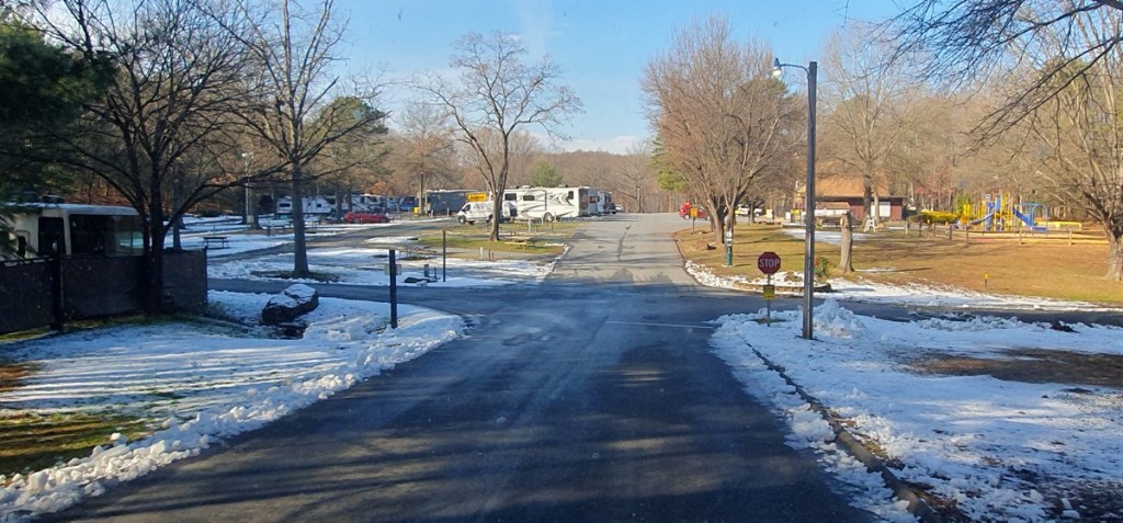 Wij rijden door naar Asheville. We willen graag de Blue Ridge Parkway rijden. Dat is een 750 km lange toeristische route over bergkammen richting het Shenadoa National Park bij Washington. Helaas heeft Orkaan Helene vorig jaar een groot deel van de route in North Carolina verwoest en nu is ook nog heel veel afgesloten in verband met de sneeuwval van vorige week. We hebben het advies gekregen om in Asheville bij het bezoekerscentrum de actuele informatie over de route op de halen. We overnachten bij het Lake Powhatan Recreation Area.