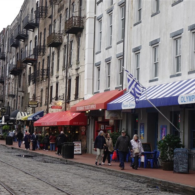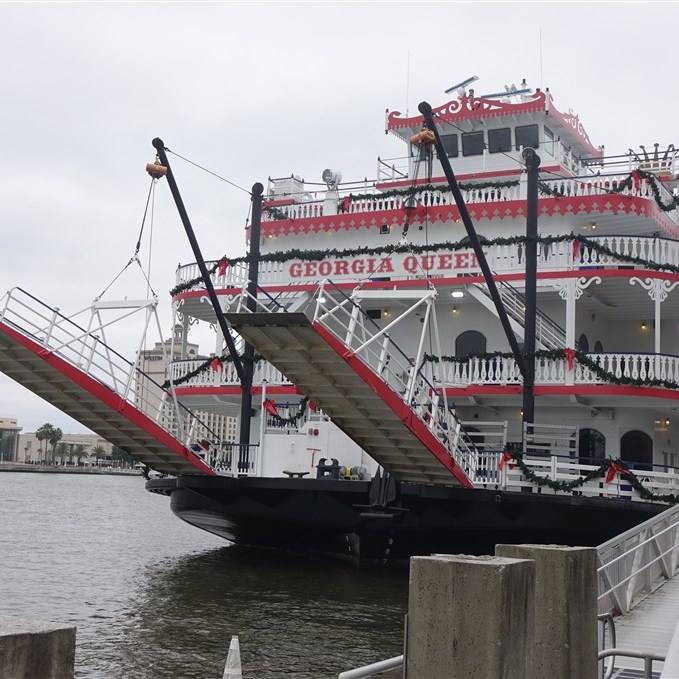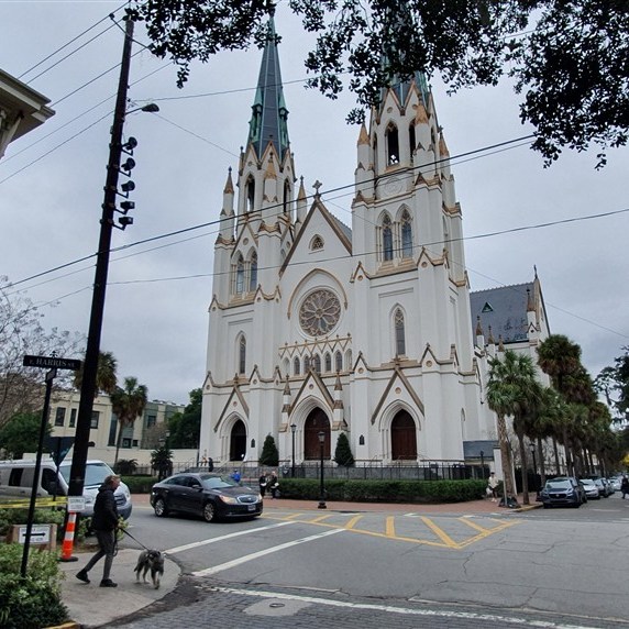 De chauffeuse vertelt aan één stuk door over de stad, de bewoners en de huizen. SCAD, Savannah College of Art and Design, heeft een belangrijke rol gespeeld bij de restauratie en het weer tot bloei brengen van de historische binnenstad. Veel huizen rond de oude pleinen zijn door hen opgekocht, gerestaureerd en nu in gebruik voor de school of voor de huisvesting van de ca. 18000 (deels internationale) studenten. We rijden kris kras door de stad langs de pleinen, de kathedraal, de city market en eindigen in de haven. Lichtelijk platgeluld stappen we uit en lopen terug naar de kathedraal. Savannah is een mooie oude stad!
