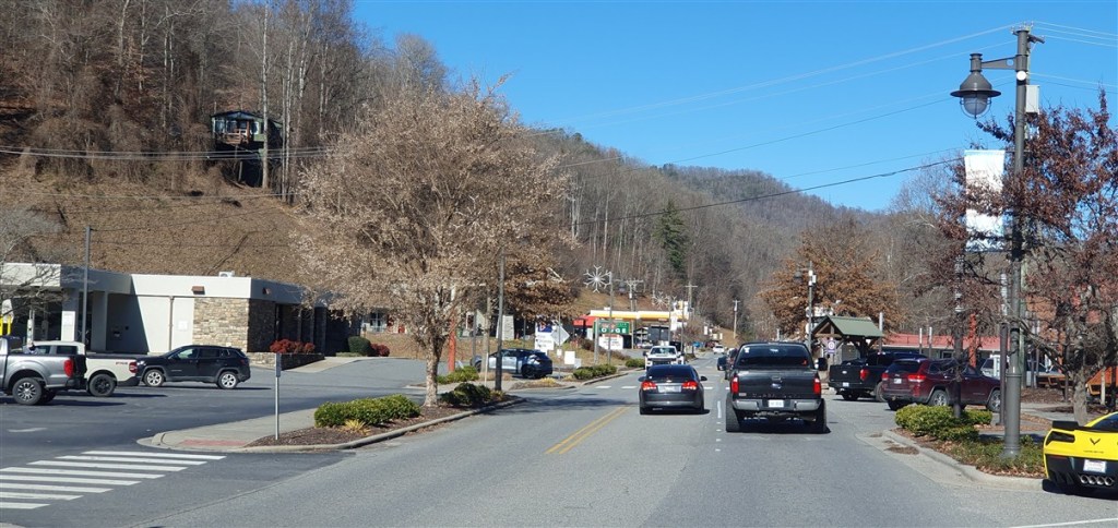 De volgende dag een mooie rit door een heuvelachtig landschap. Vlak voor de Smokey Mountains rijden we een toeristisch, beetje wintersport achtig, gebied binnen.