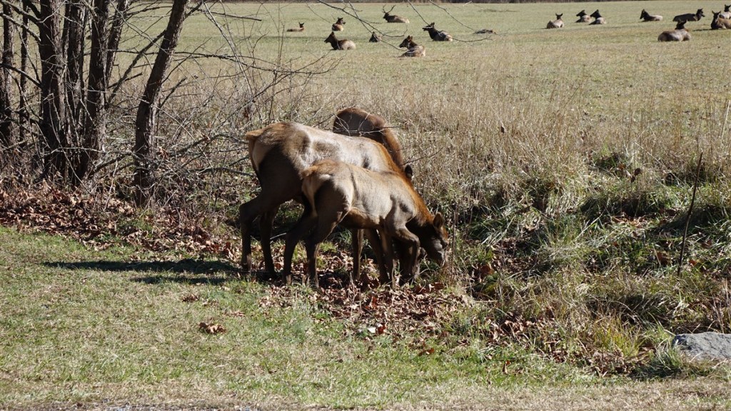 Bij de entree van het National Park loopt een grote kudde elks. Zo’n grote groep hebben we nog niet eerder gezien.