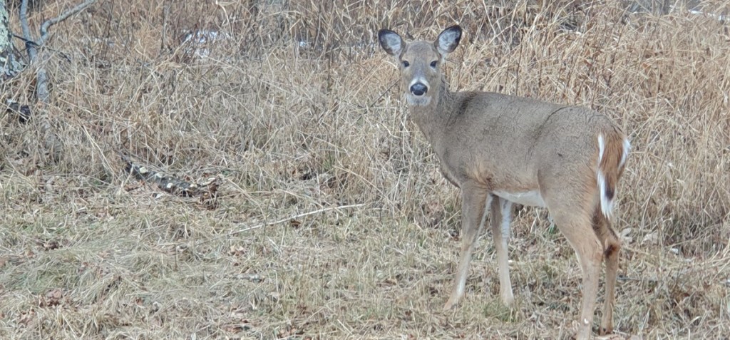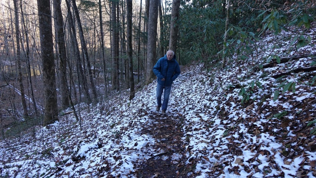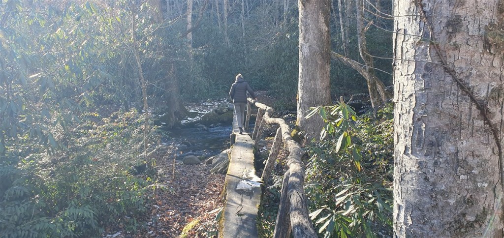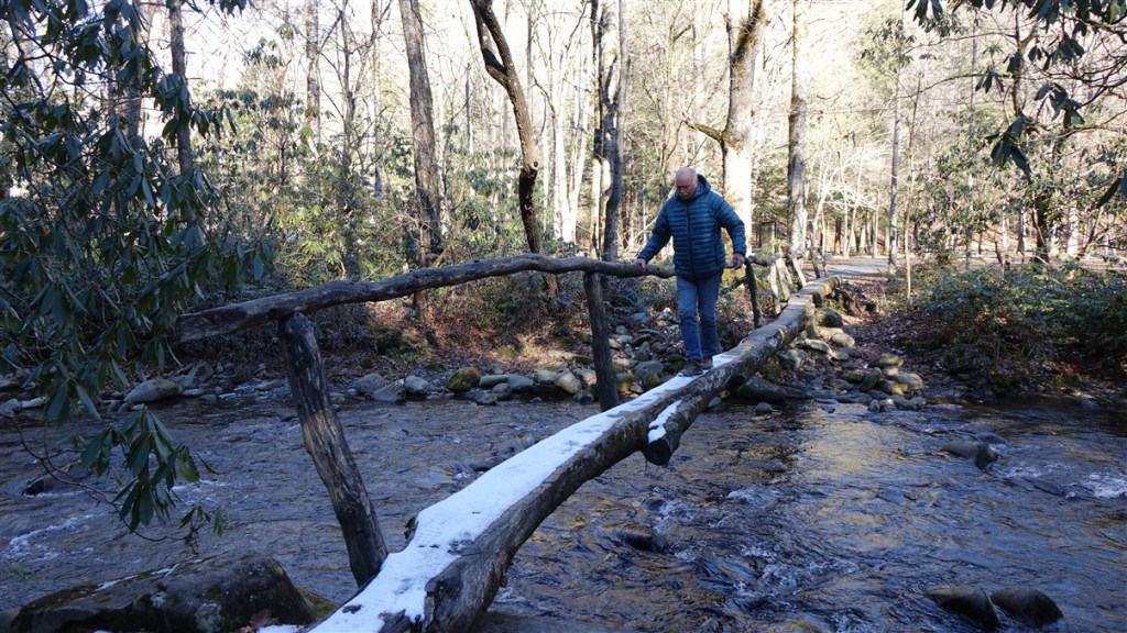 We installeren ons en gaan aan de wandel. We lopen een Nature Trail. Deze begint met een bruggetje van boomstammen over de rivier…. Ligt her en der nog wat sneeuw en het is koud. 1,5 tot 3˚C. Mooie wandeling met een forse klim en afdaling.