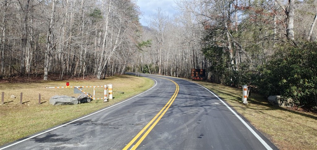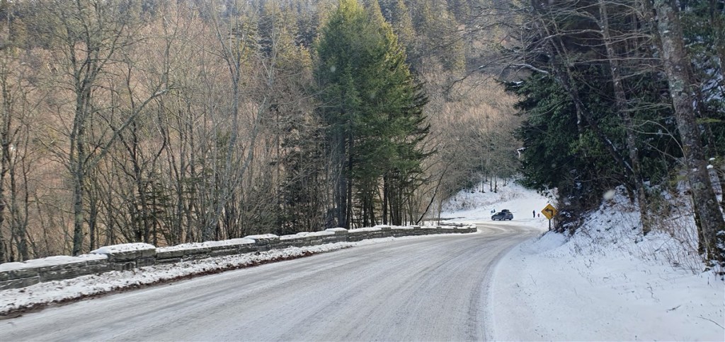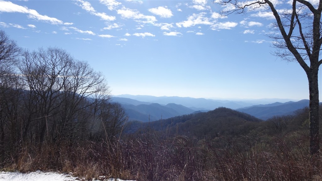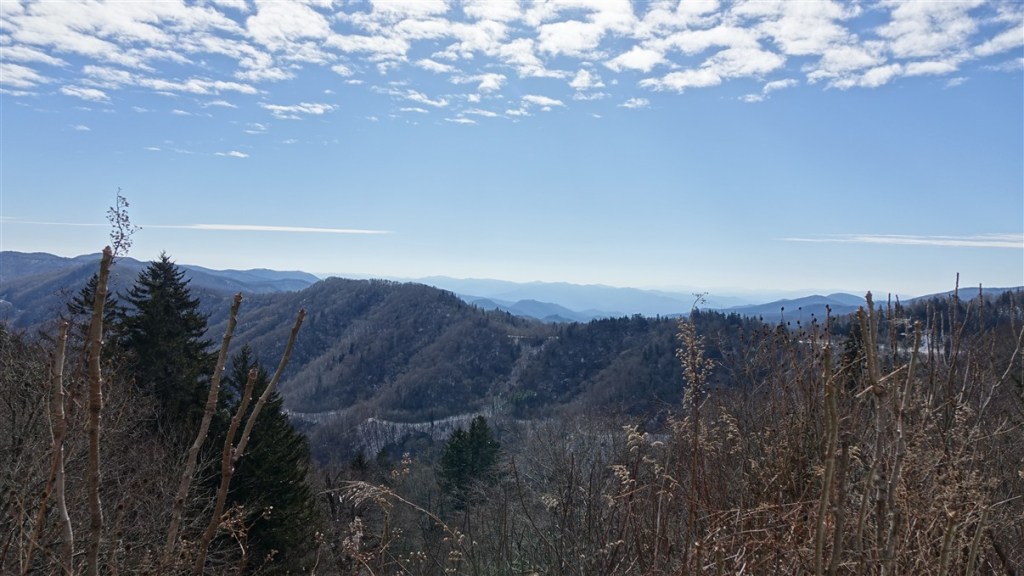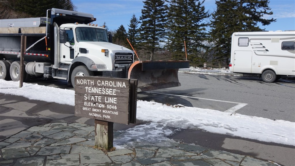 Als we de volgende ochtend willen vertrekken horen we van de ranger dat de Hwy 441 net 5 minuten geleden weer is vrijgegeven. Super! We kunnen door het park. Het is een mooie route door de bergen met uitkijkpunten en veel bos. Hoogste punt is ca. 1600 m en hier ligt nog best veel sneeuw en ijs. Het is prachtig winterweer en op de staatsgrens tussen North Carolina en Tennessee stoppen we even om het uitzicht te bewonderen!