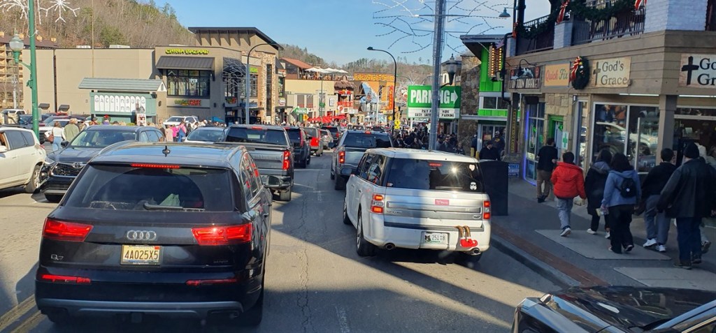 Via een mooie kronkelende weg langs de rivier rijden we de Smokey Mountains uit naar Gatlinburg. En daar is het druk! Zo druk hebben we nog zelden in Amerika meegemaakt. Wintersportdorp op en top!