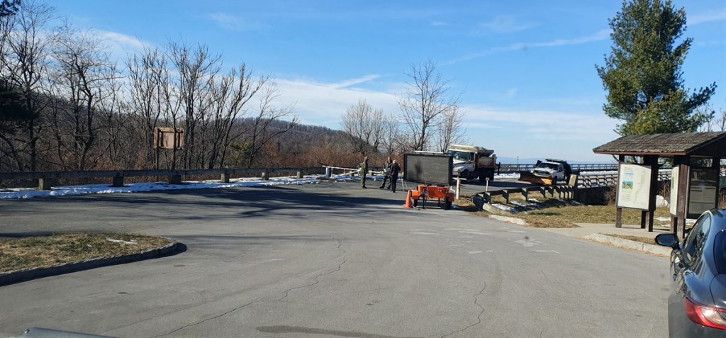 Omdat de Blue Ridge Parkway niet lukt hebben we nu onze zinnen gezet op het laatste stuk, de Skyline Drive in Shanadoa National Park. Deze zou volgens ene website wel, en volgens de ander niet, open moeten zijn. We gaan het zien. We rijden naar het begin bij Wayenesboro. Dicht dus! Rangers, die met het schoonmaken van de weg bezig zijn, verwachten (zonder garantie uiteraard) dat de weg morgen weer opengaat.