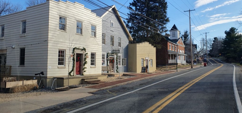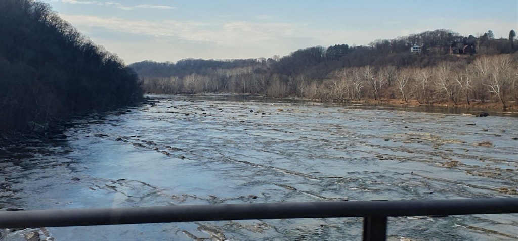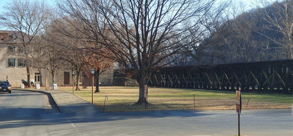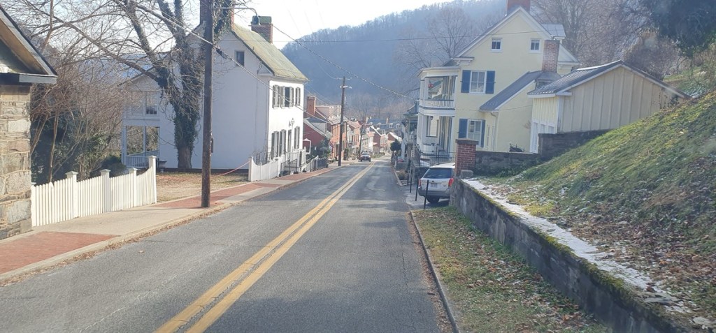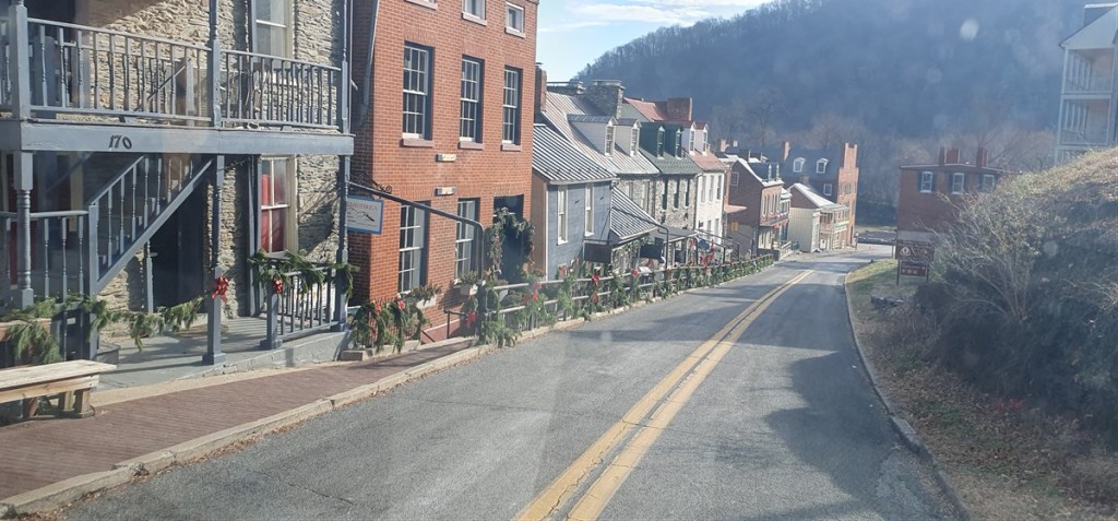 Het is jammer genoeg wel bewolkt en we besluiten na zo’n 60 kilometer toch de snellere route naar de camping bij Harpers Ferry te nemen. Om vijf uur is het donker en in het donker rijden onder deze omstandigheden vinden wij geen van beiden een optie. Net voor donker rijden we de camping op. Het is nog steeds koud, maar lang niet meer zo erg als de afgelopen dagen. Overal ligt nog wel een beetje sneeuw. De volgende ochtend rijden we door Harpers Ferry, waar de rivieren de Potomac en de Shanadoa bij elkaar komen. In de burgeroorlog was dit een strategische positie en de noordelijke en zuidelijke troepen waren hier afwisselend aan de macht (het stadje is 8 maal veroverd). Het is een mooi oud stadje met prachtige houten huizen met veranda’s in kerstsfeer.