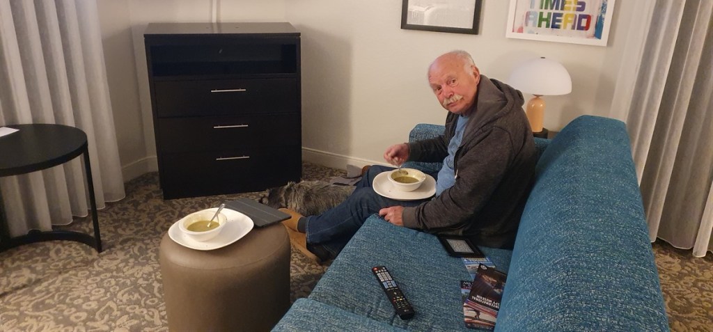 Total loss hijsen we hem binnenboord en rijden we naar Washington Dulles. Hier hebben we een hotel geboekt vlak bij het vliegveld. Blijkt een superluxe suite met woonkamer, slaapkamer, keuken en badkamer. Mooi! Auto leegmaken en alles klaarmaken voor morgen. Rond 19:00 zijn we klaar en hebben we het ook wel een beetje gehad. Tijd voor erwtensoep. Een wat dunne Amerikaanse variant!